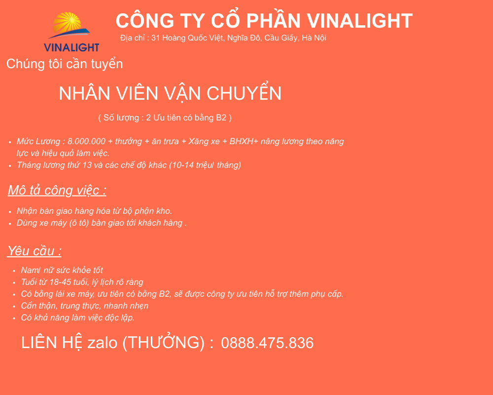 CÔNG TY VINALIGHT CẦN TUYỂN GẤP :