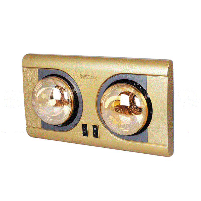 Đèn sưởi nhà tắm treo tường 2 bóng Kottmann K2BNV có màu vàng kim với hoa văn sang trọng, kích thước nhỏ gọn phù hợp lắp đặt cho phòng tắm có diện tích từ 2 – 4 m2.